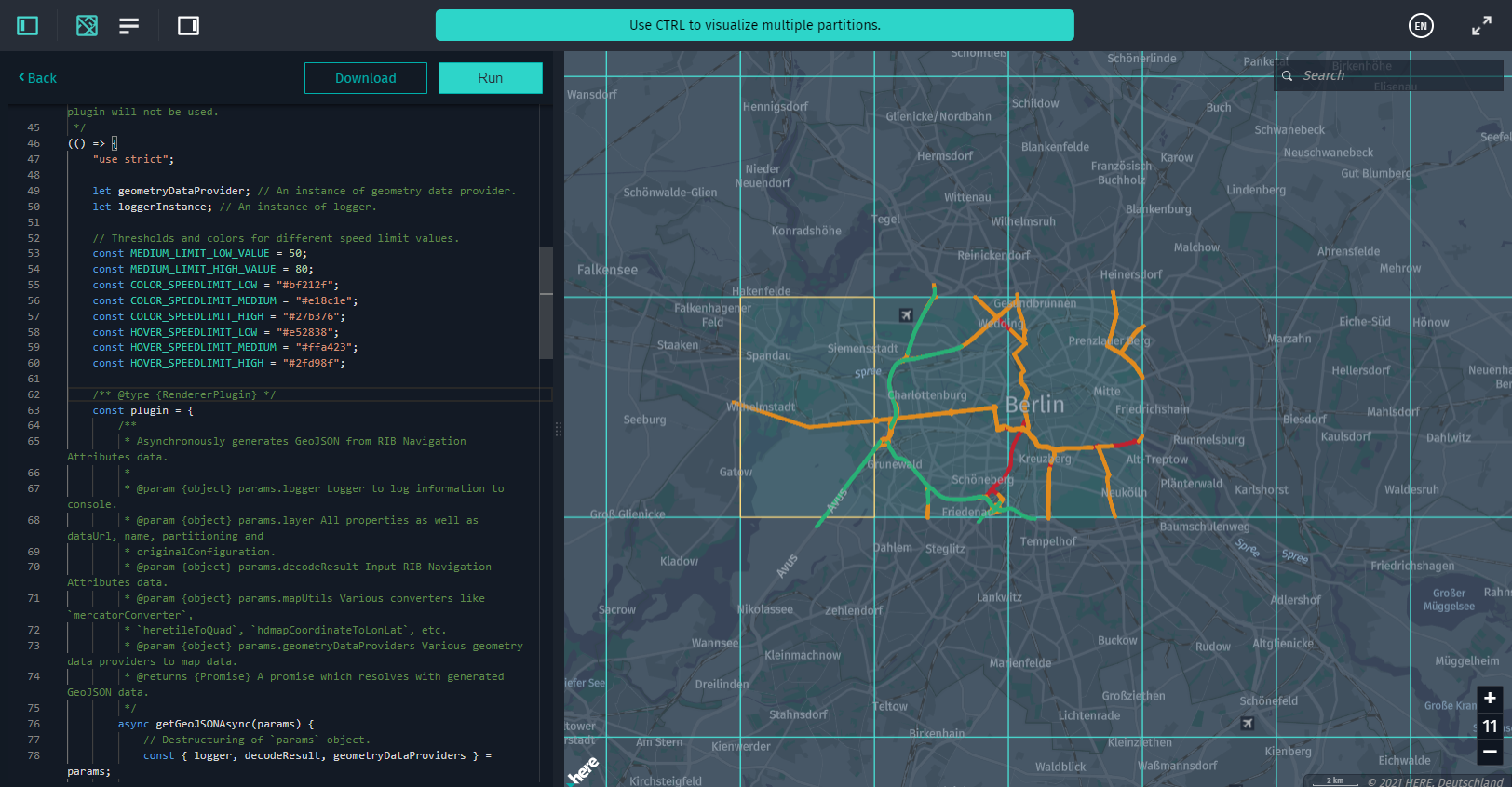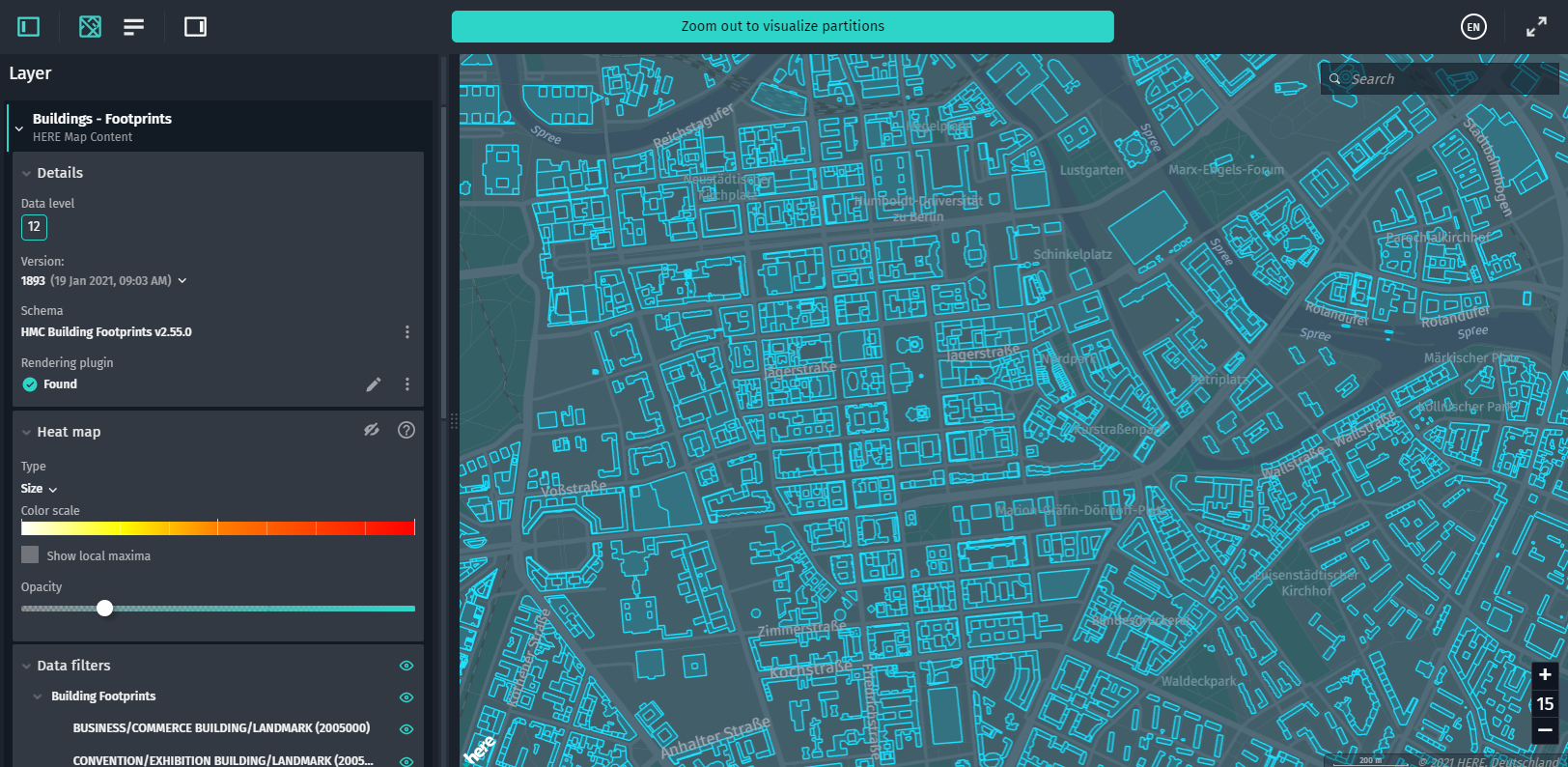 RibControls: A set of control widgets for@here/rib-datasourcethat allow for HERE Map Content Data features filtering: switching on/off segments, nodes from the Topology layer, different categories of objects from the Roads - Topology & Geometry and Building Footprints layers. -