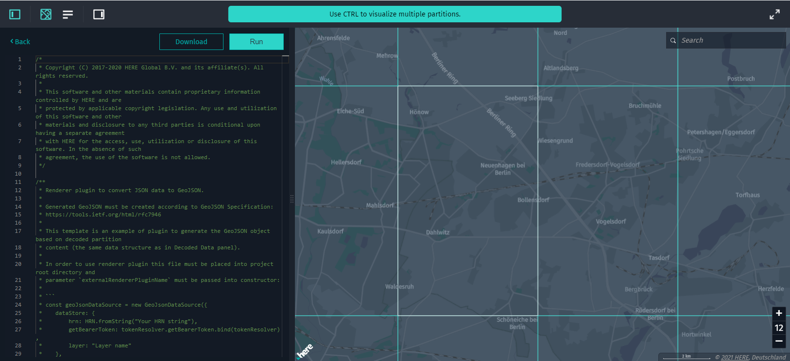 To launch your plugin code, click the Run button above. The layer data is rendered in the Data Inspector Library map view. Once satisfied with the results, you can download the modified JS file to save your code with the Download button.