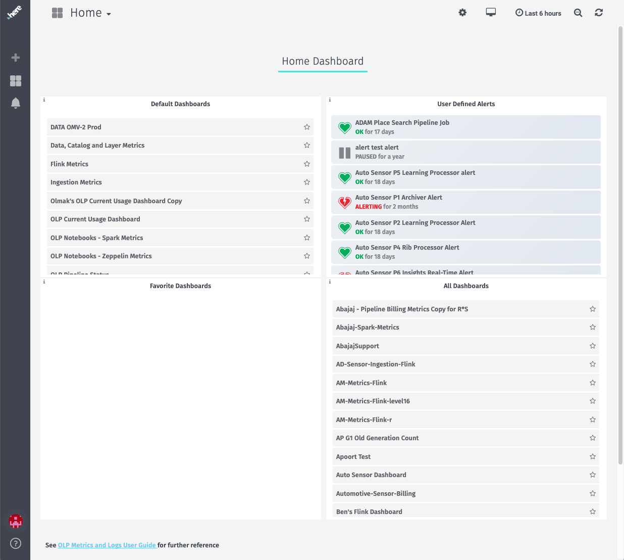 The Grafana home page includes a list of available dashboards as shown in Figure 1. Default dashboards available for HERE Workspace include the following.