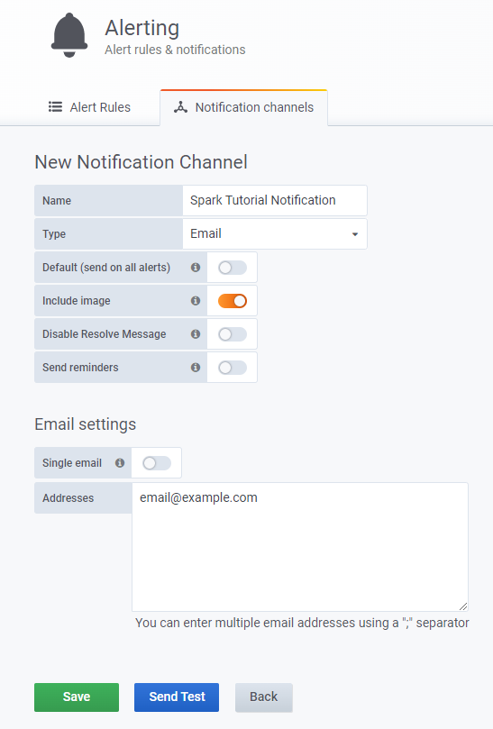 Example Channel, selectemailin the type field and specify your email addresses[email protected]in theEmail settingschapter: