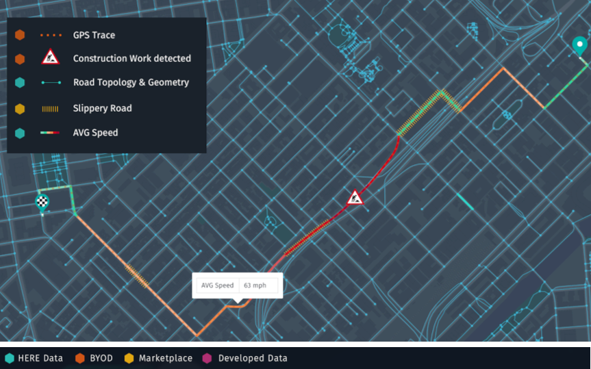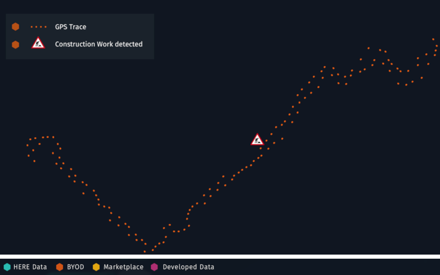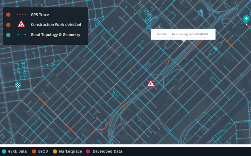 Imagine you have sensor data from vehicles that have detected construction work along with a GPS trace. Using this data, you might want to create a map with recommended speeds by using context information from the HERE Map Content and additional data that may be licensed on the Marketplace.