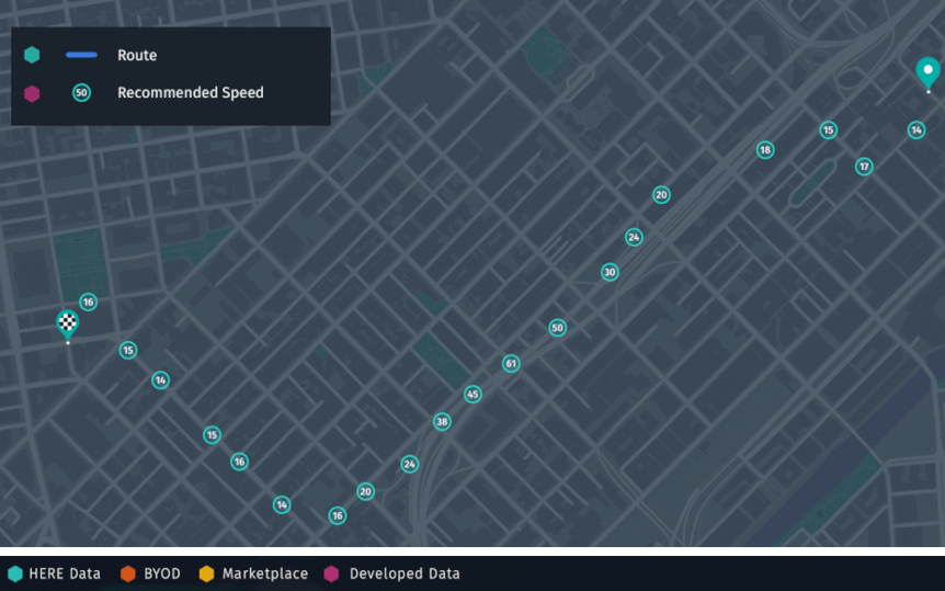 The figure below illustrates the result of your business logic for one vehicle trace. Combining the data from many vehicles gives you a full map of recommended speeds to offer on the Marketplace.